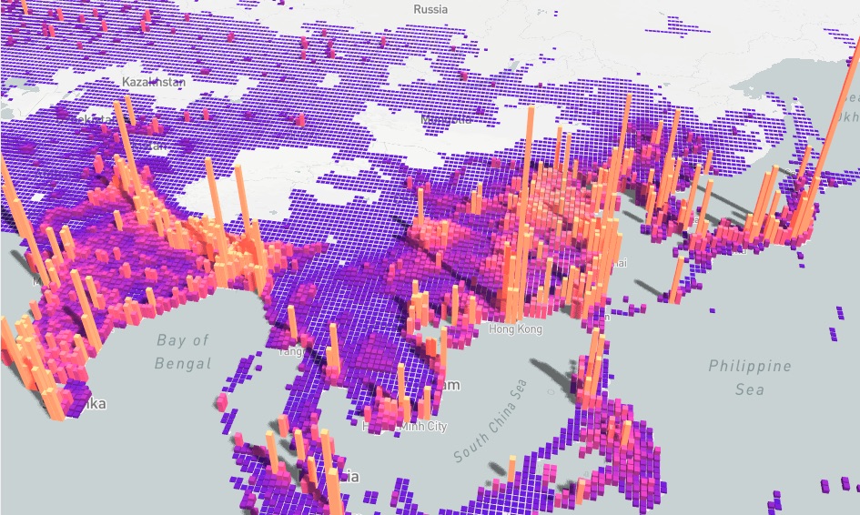 ECharts 甚至允許您在 VR 和其他大螢幕場景中進行 3D 視覺化。基於 WebGL 的 ECharts GL 讓您能夠像渲染其他 ECharts 元件一樣輕鬆地渲染 3D 地球、建築物和人口分佈直方圖。此外,只需幾行配置更改,簡單的配置項就能讓您新增特效。